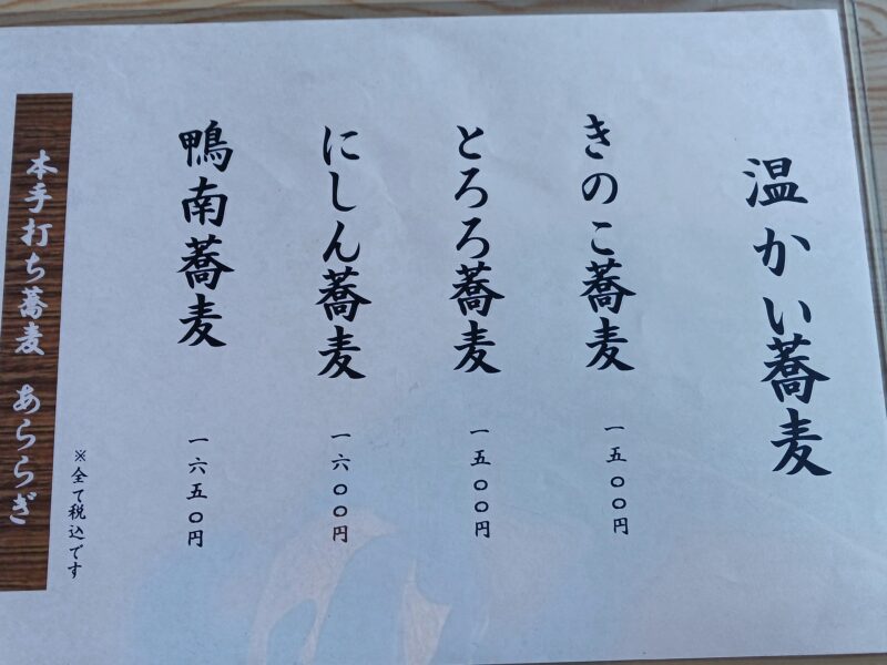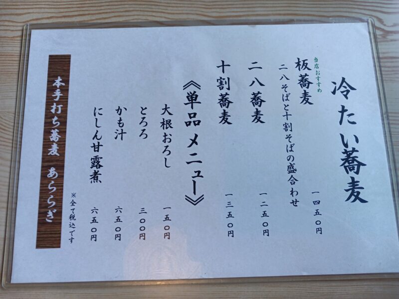 本手打蕎麦あららぎはお蕎麦屋さんです。メニューはお蕎麦のみになります。