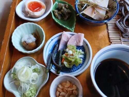 左に汁・薬味・小鉢。右に蕎麦が盛られています。