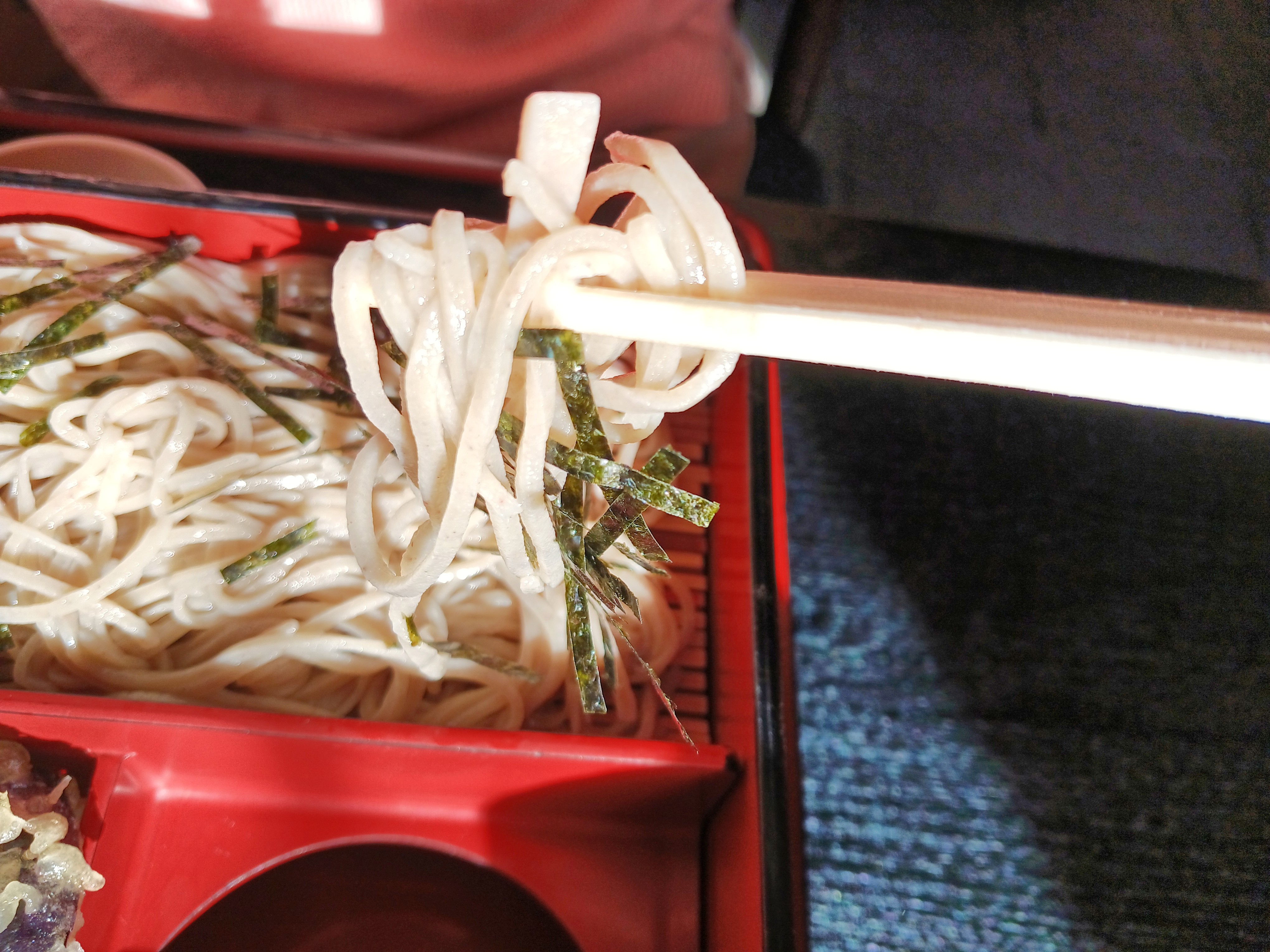 箱そばのような姿ですね。そばは細打ちを選んでいます。