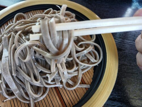 そばの太さはやや不揃い。田舎そばとしても太いほうですね。やや柔らかくもは感じますが、もぐもぐと食べるそばです。
