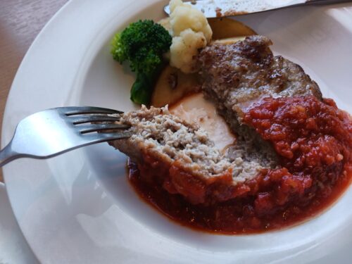 切ってみて1口。かなり細かく挽かれていて、ふわふわとした食感に焼き上げられています。お肉は牛+豚。種はほぼ下味が感じれれないぐらい。それで肉の臭みは感じないので、これはこれでありでしょうか。最近、ナツメグ使わないお店も増えてきているとも聞きました。