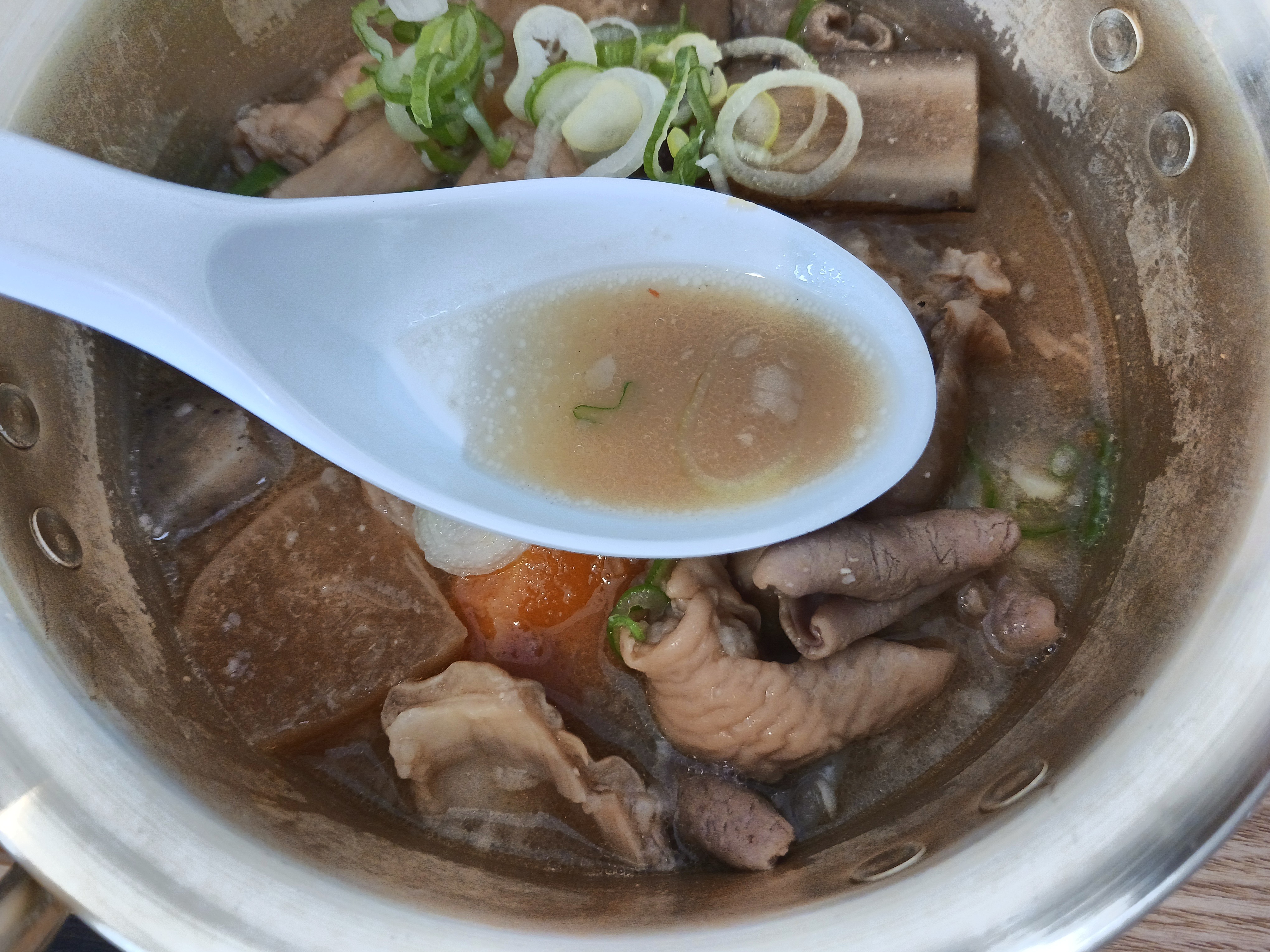 底からすくうと、わりとサラッとした汁で熱々。味噌の具合は塩味やや控えめ。もつは臭みもなく、硬いということもないです。野菜もゴロゴロと入っていて満足できる1品ですね。