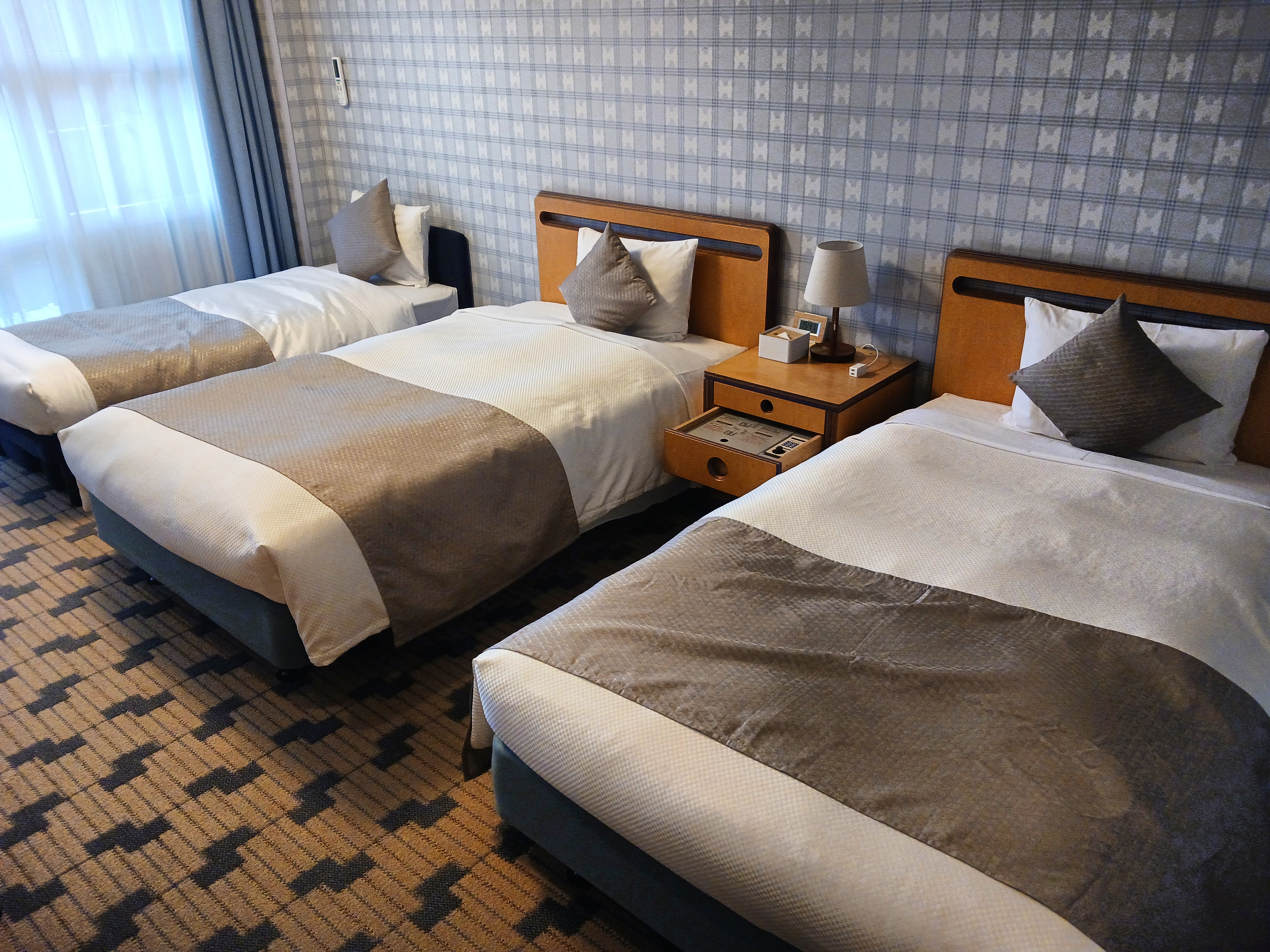 3人定員ですので1台はエクストラベッドです。ほとんど部屋以外のラウンジなどにいるのであれば寝るだけ。そう狭くも感じません。