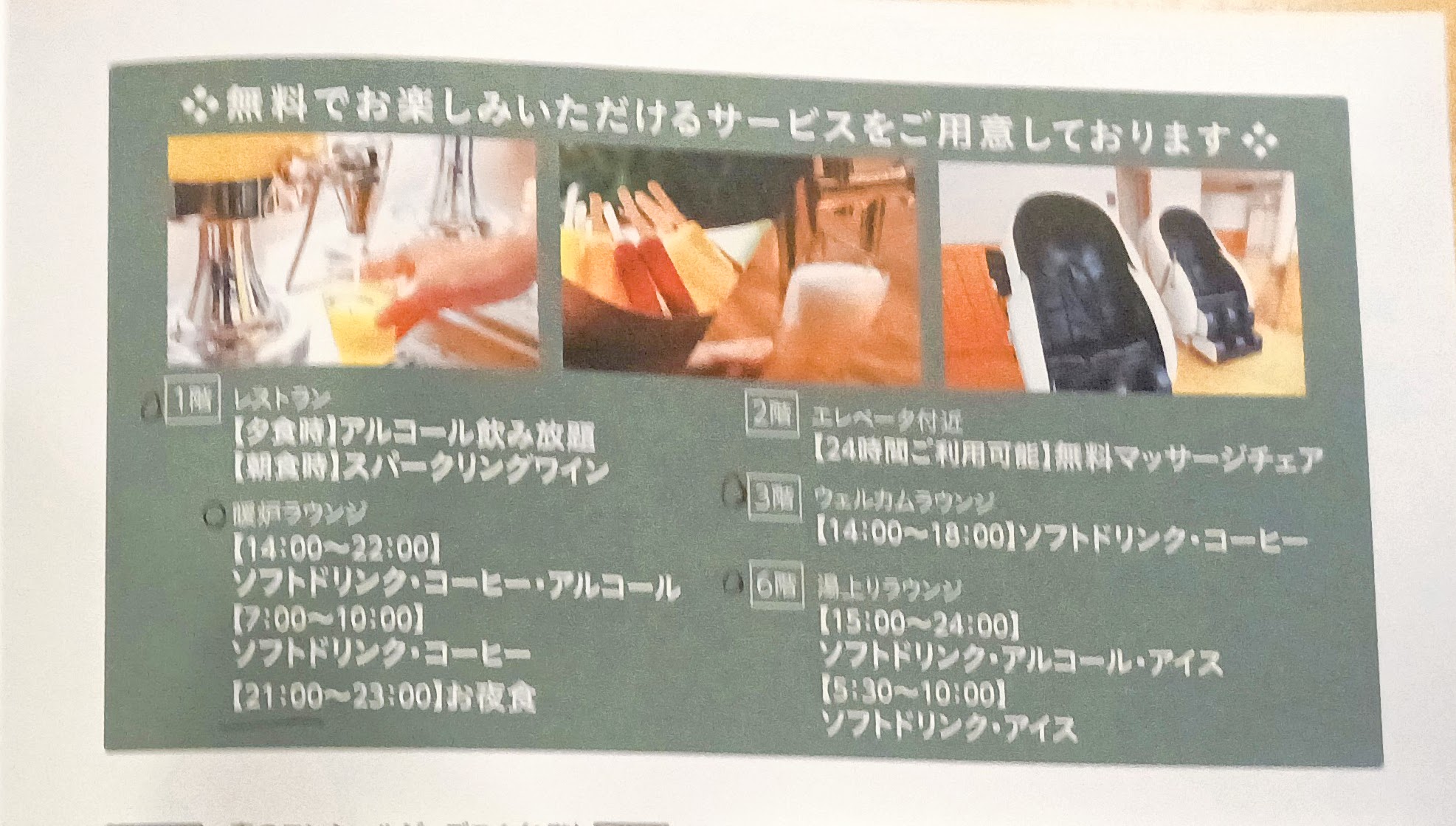 これで夜も終わり。マッサージチェアは体験できませんでしたが、14時から23時までたっぷりと楽しめるという印象です。