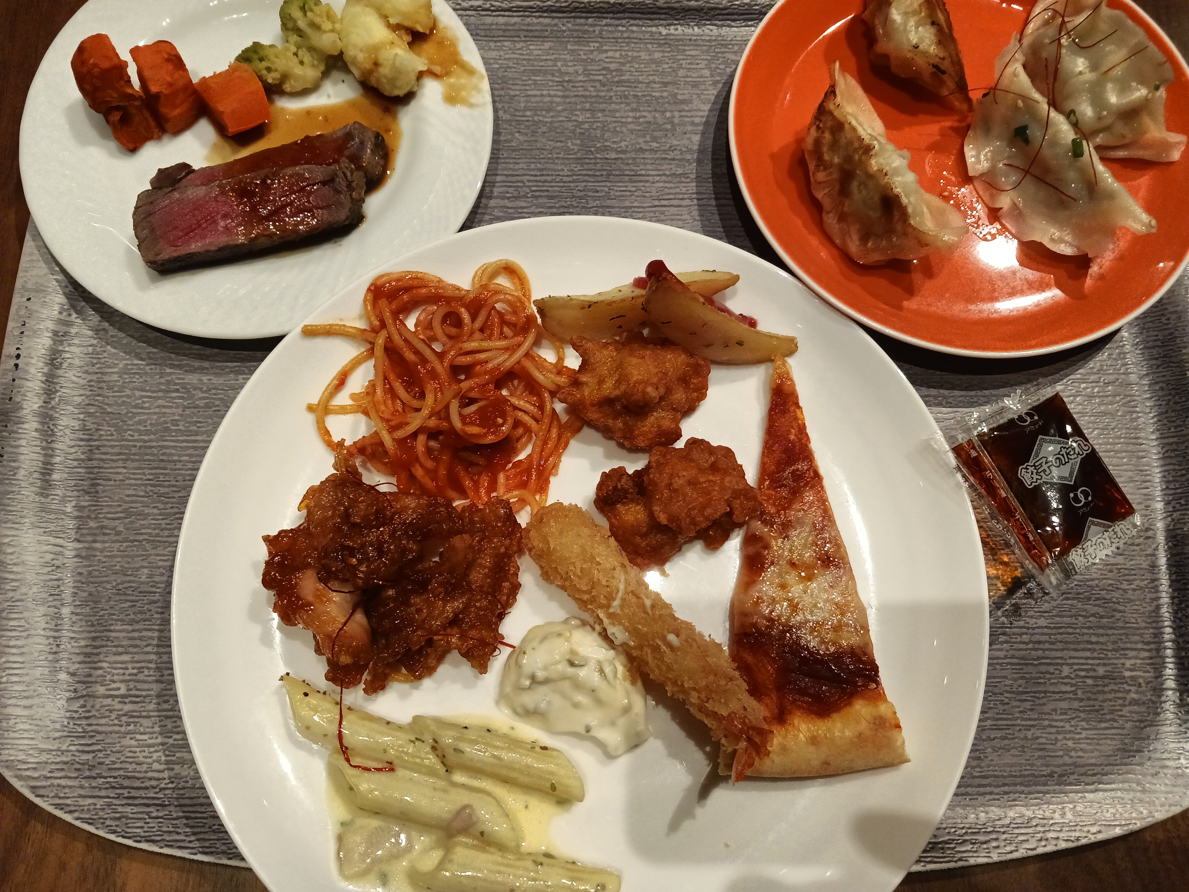 目の前でカットされるステーキはほどよい硬さでなかなか。トマトソースのパスタは案外いけます。ピザ・餃子は温かければと感じました。ちなみに餃子は健太餃子とのことです。